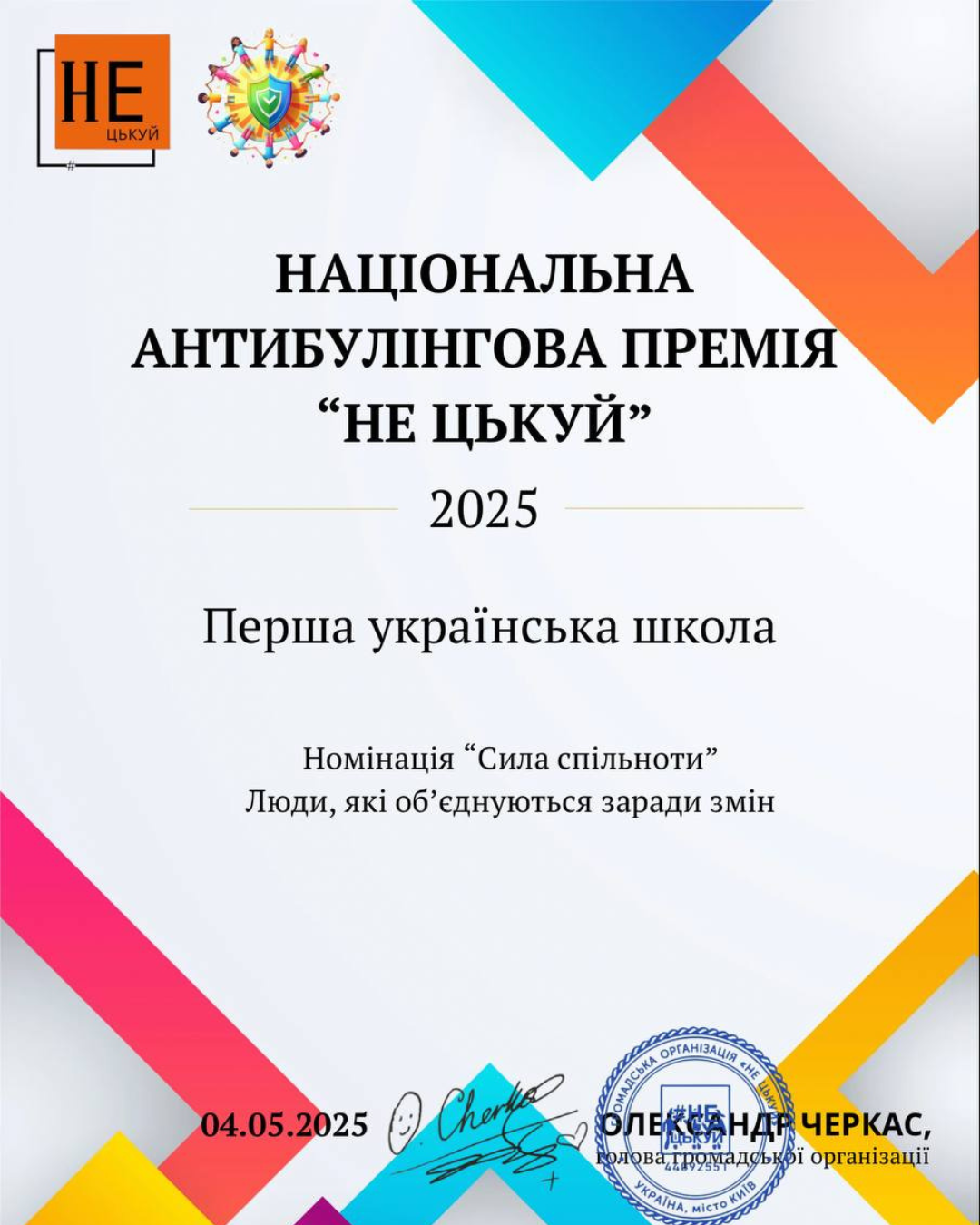 Ми раді поділитися важливою новиною: Перша українська школа стала переможцем Національної антибулінгової премії "Не цькуй" 2025 у номінації «Сила спільноти». Ця нагорода вручається ініціативам, які об'єднують людей заради позитивних змін у шкільному середовищі, і для нас вона має особливе значення.